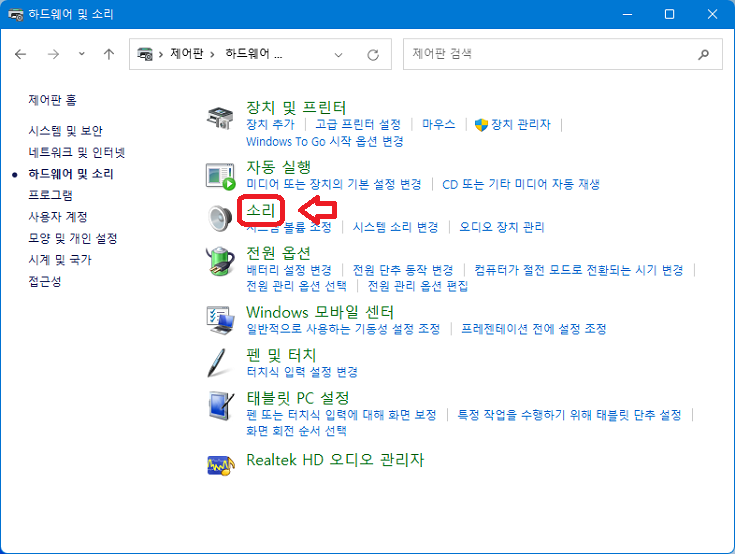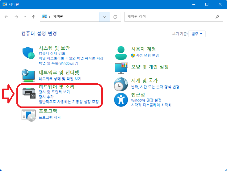 이어서 "하드웨어 및 소리"를 클릭하자.