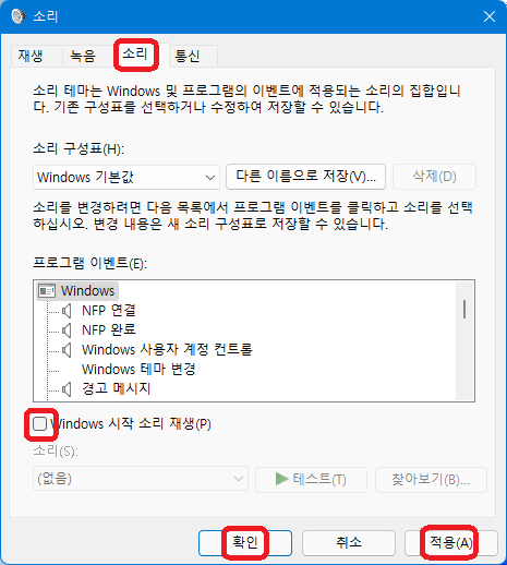 "소리" 탭을 클릭한 다음 "Windows 시작 소리 재생" 부분을 체크 해제하고,