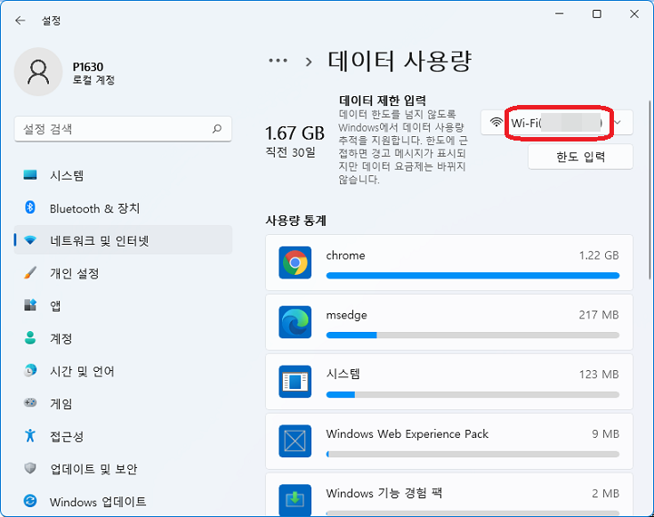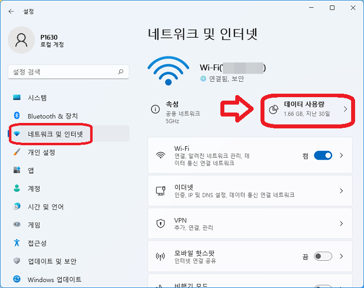 이어서 좌측의 "네트워크 및 인터넷"을 클릭하면 현재 사용중인 네트워크 장치(와이파이, 유선랜 등등)의 데이터 사용량을 확인할 수 있다.