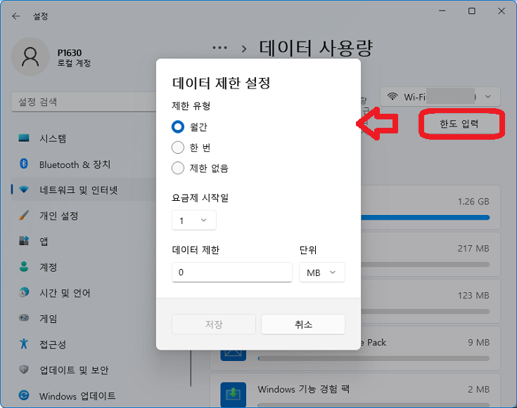 "한도 입력"을 클릭하면 데이터 사용량을 제한할 수 있다.