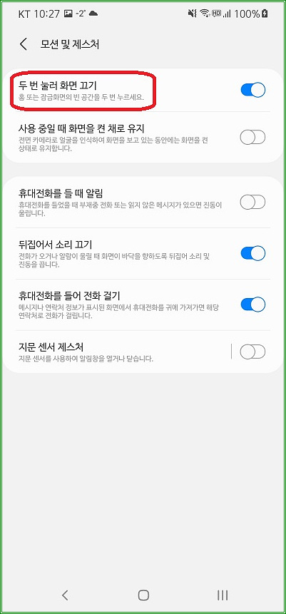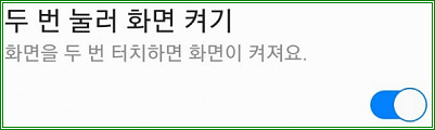 "두 번 눌러 화면 끄기(노크오프)" 혹은 "두 번 눌러 화면 켜기(노크온)" 스위치를 켜거나 끄자.