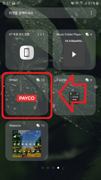 홈 화면에 페이코 위젯이 추가되었다.