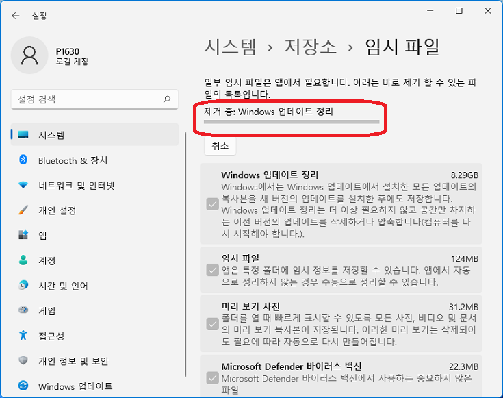 보시다시피 "Windows 업데이트 정리"의 용량이 무려 8.29GB나 된다. 이걸 삭제하면 용량은 확보되지만 이전 빌드 혹은 이전 버전의 윈도우로 되돌아갈 수 없다.