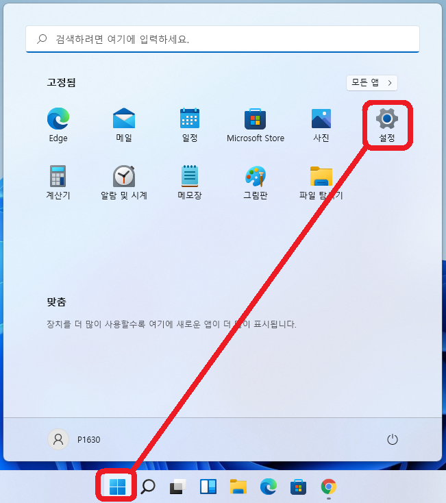 시작버튼을 클릭하고 설정 버튼을 클릭하자.