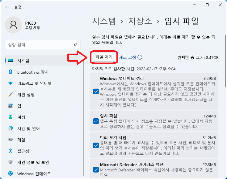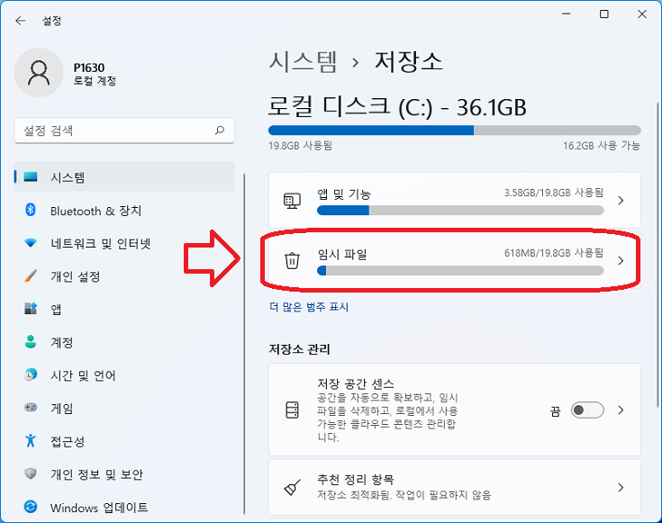 (하단에 "추천 정리 항목"이라는 것도 있지만, 개인적으로는 꼭 필요한 파일들을 삭제하라고 떠서 권장하지 않음)