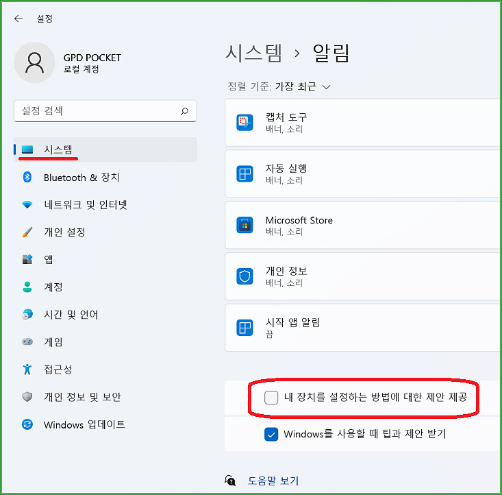 *. 윈도우10의 경우 "Windows를 최대한 활용할 수 있도록 내 장치 설정을 마치는 방법 제안"이다. 윈도우11에서 "내 장치를 설정하는 방법에 대한 제안 제공"으로 바뀌었다.