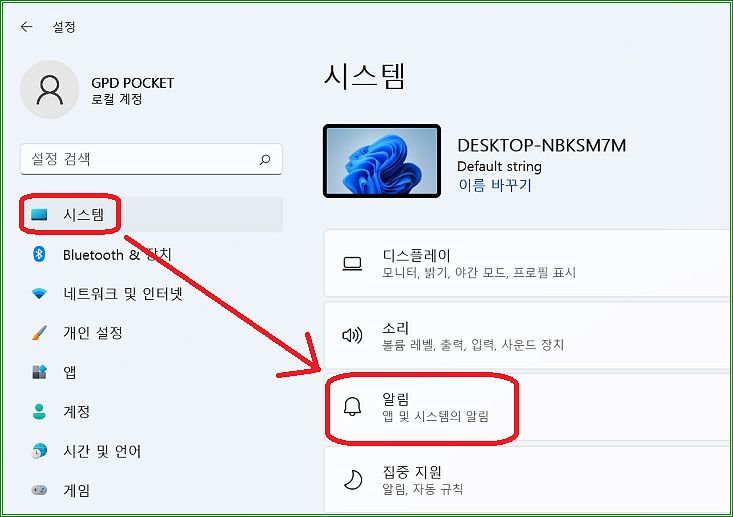 2. "시스템"을 클릭하고 "알림"을 클릭하자.