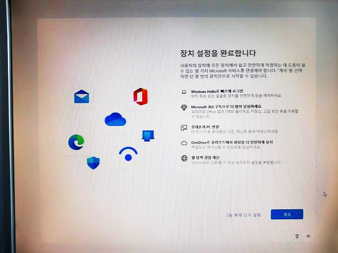 그런데 윈도우11을 오프라인 계정(로컬 계정)으로 사용하다 보면 이따금씩 "장치 설정을 완료합니다"라는 창이 뜬다.