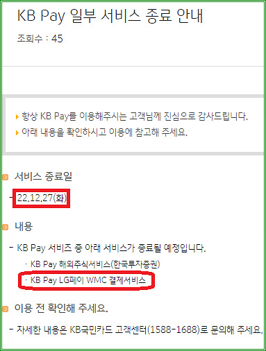 ※ KB Pay와 LG페이 연동 서비스가 2022년 12월 27일 종료된다.
