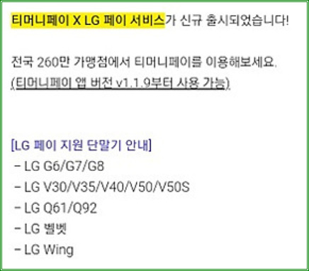 티머니페이 LG페이의 경우 일부 G 시리즈(G6 이상), V 시리즈(V30 이상), Q 시리즈(Q61, Q92), 벨벳, Wing에서만 사용 가능하다.