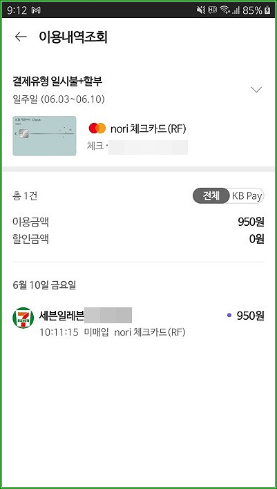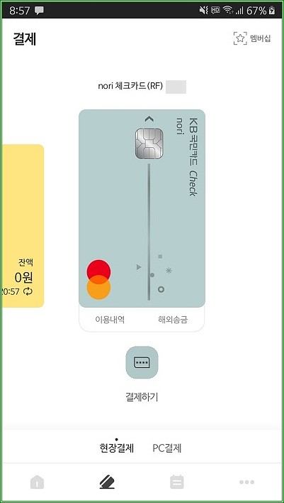 KB페이 앱을 설치하고 신용카드 혹은 체크카드를 등록한 모습.