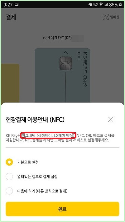 KB페이 앱만 사용한다면 "기본으로 설정"을 선택해도 되는데, 삼성페이 교통카드나 타 앱 교통카드를 사용한다면 "열려 있는 앱으로 결제 설정"이나 "다음에 하기(다른 방식으로 결제)"를 선택하는 것을 권장한다.