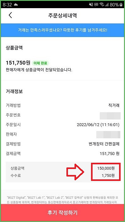 15만원 결제시 수수료는 5,250원이지만, 번개페이로 처음 결제해서 그런지 할인 적용되어 1,750원이 청구되었다.