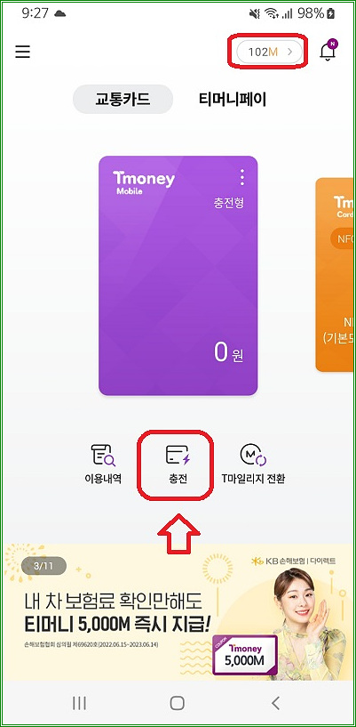 모바일티머니 앱을 설치하고 "충전"을 터치하자.