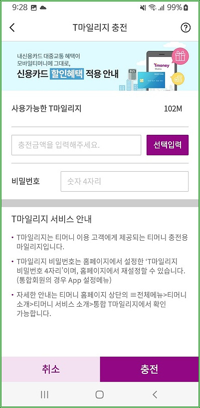 충전수단으로 T마일리지를 선택하고 "충전하기"를 터치하면 된다.