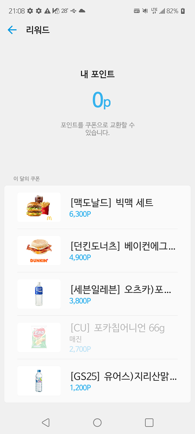 적립받은 리워드 포인트로 과자, 햄버거, 음료 쿠폰을 받을 수 있다.