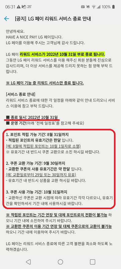 아쉽지만 LG페이 리워드 서비스는 2022년 10월31일 종료된다.