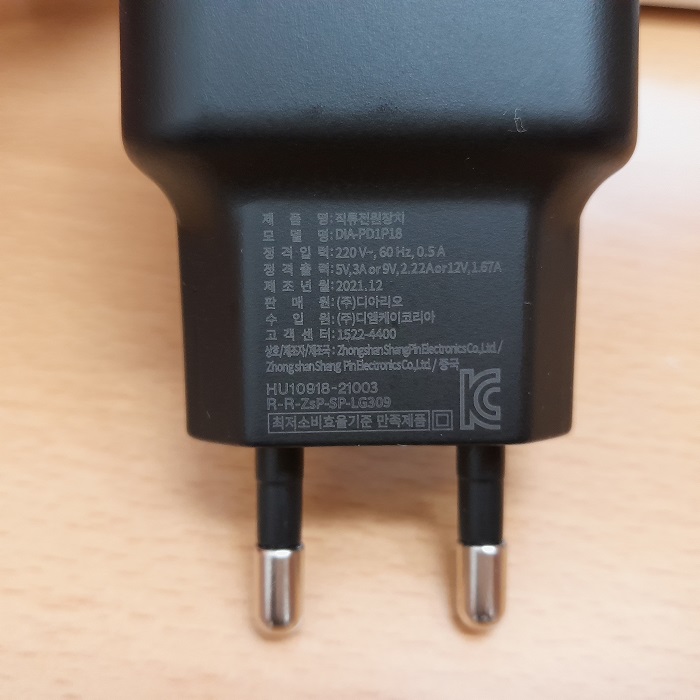 충전기에는 내접지 마크가 있긴 한데 (위 사진 우측 하단 KC마크 왼쪽의 回자 모양의 마크가 내접지 처리가 되어 있다는 뜻이다), 삼성 정품 충전기를 사용했을 때보다 많이 찌릿하다.