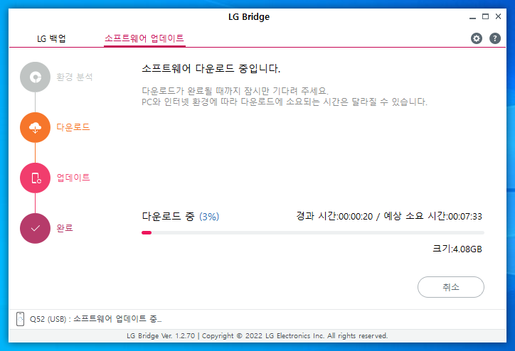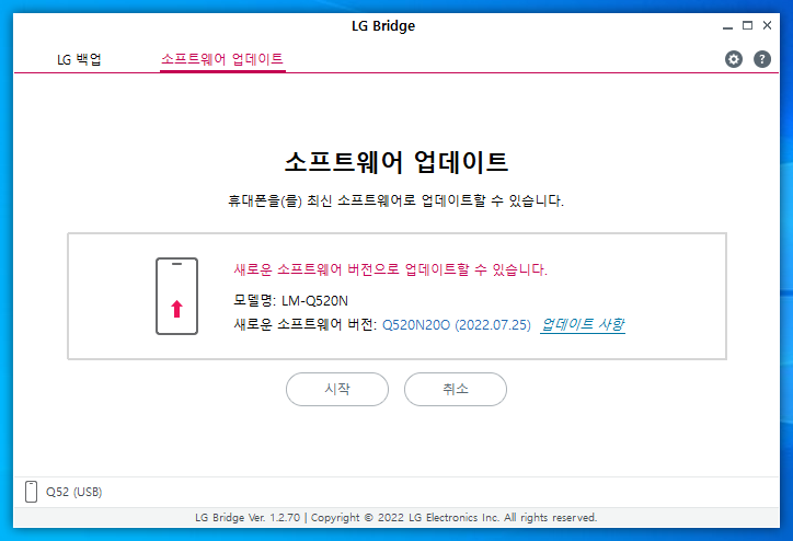 LG Bridge 설치가 완료되면 폰과 컴퓨터를 케이블로 연결하고 "소프트웨어 업데이트"를 클릭하자.