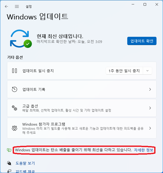 탄소 배출이 가장 적은 시간에 업데이트가 이루어지고, 업데이트 소요시간도 확실히 윈도우10보다는 줄었다.