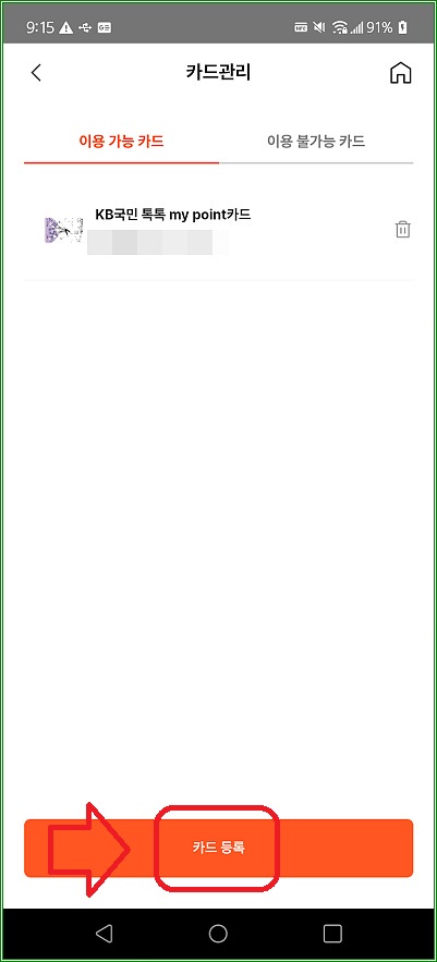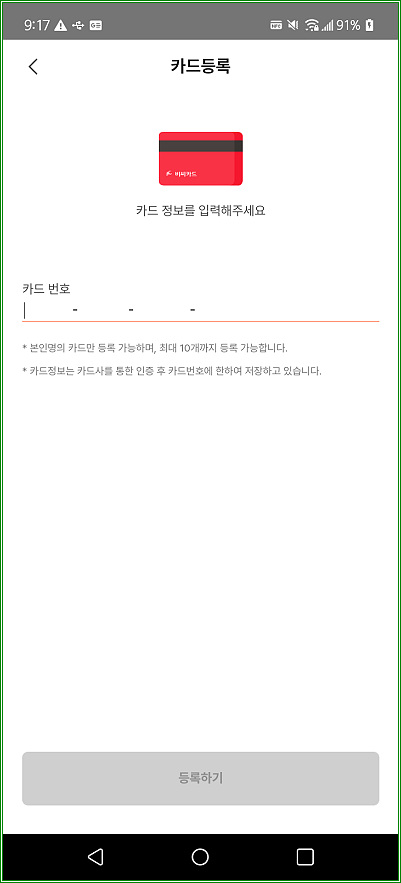 앱 초기화면에서 "카드관리"를 터치하고 "카드 등록"을 터치하자.
