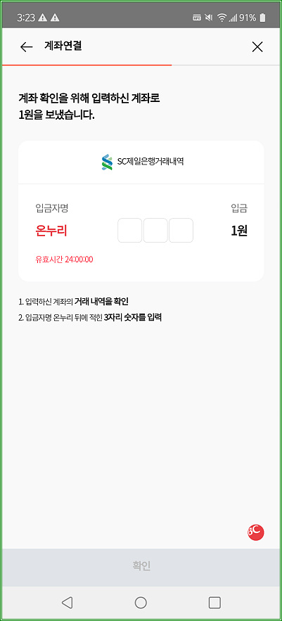 본인인증 과정 중 계좌로 1원이 입금되는데, 예금주 이름 뒷부분의 세자리 숫자를 입력해야 한다.