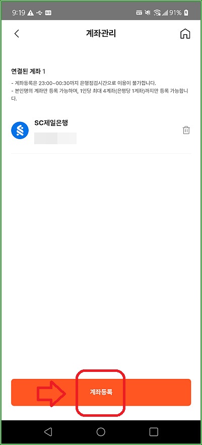 계좌번호를 여러 개 등록할 수 있는데, "계좌등록"을 터치하자.