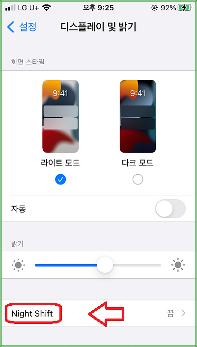 "Night Shift"라고 적혀 있는 부분을 터치하자.