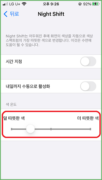 추가적으로 Night Shift가 적용되는 시간을 조정할 수도 있다.