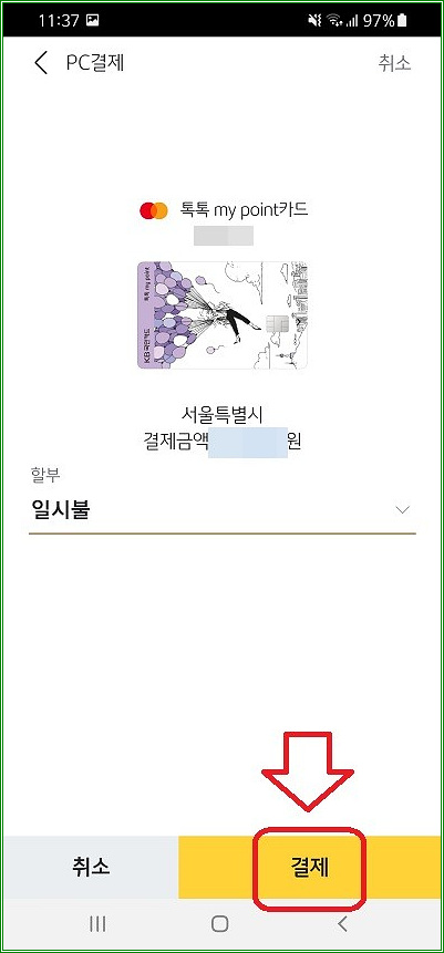 KB페이에서 결제할 카드를 선택한 다음 "PC결제"를 터치하자.