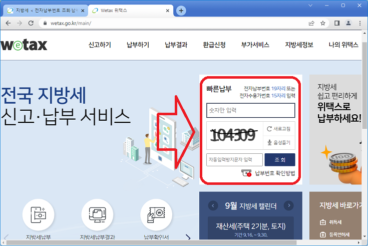 "빠른납부" 칸에 지방세 고지서의 전자납부번호 19자리 혹은 전자수용가번호 15자리를 입력하자.