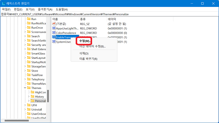 키로 들어가서 우측에 뜨는 EnableTransparency를 마우스 우클릭하고 "수정"을 클릭하자.