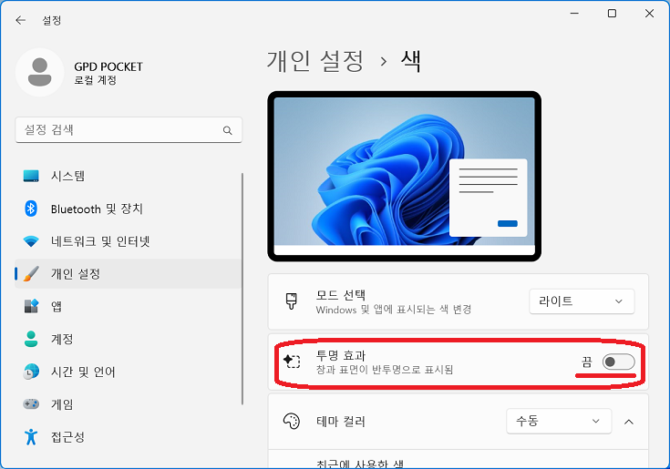 "개인 설정"-"색"-"투명 효과" 항목 스위치를 켜거나 끄면 된다.