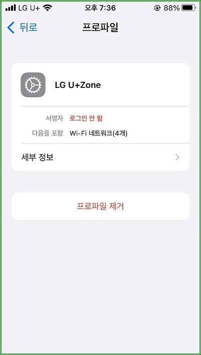 프로파일을 실행하면 위와 같이 "VPN 및 기기 관리" 항목에 LG U+Zone이 등록된다.