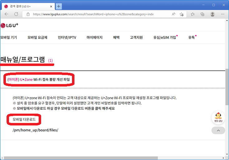 하단의 매뉴얼/프로그램-(아이폰) U+ Zone 어쩌구-"모바일 다운로드"를 터치하고 실행하자.