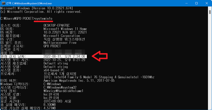 명령 프롬프트가 뜨면 systeminfo 를 입력하고 엔터키를 치면 이런저런 시스템 정보가 주르륵 뜬다.