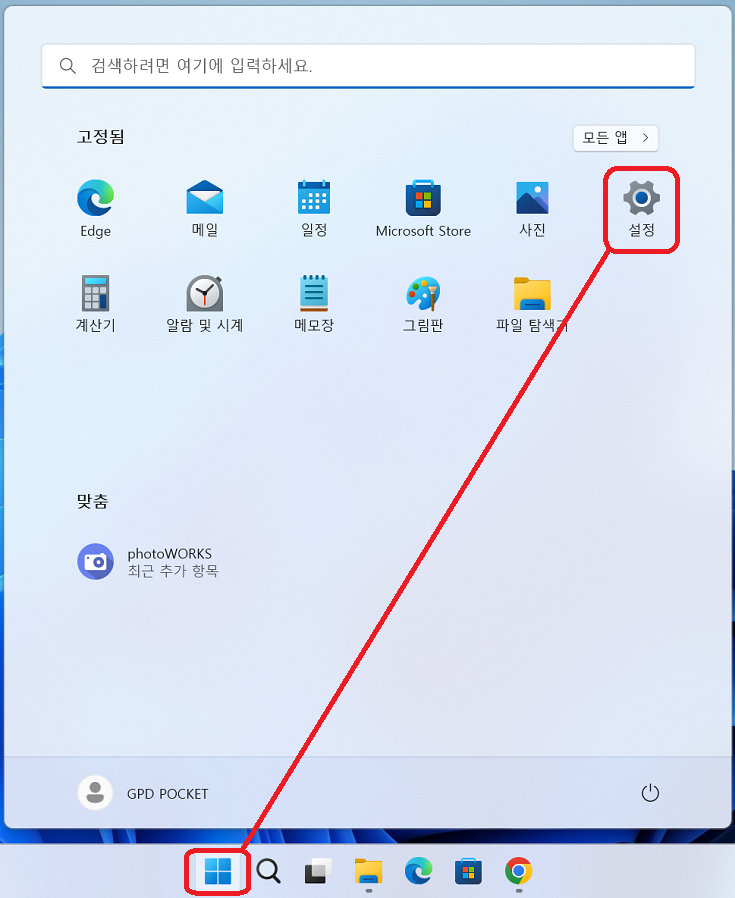 시작 버튼을 클릭하고 "설정" 버튼을 클릭하자.