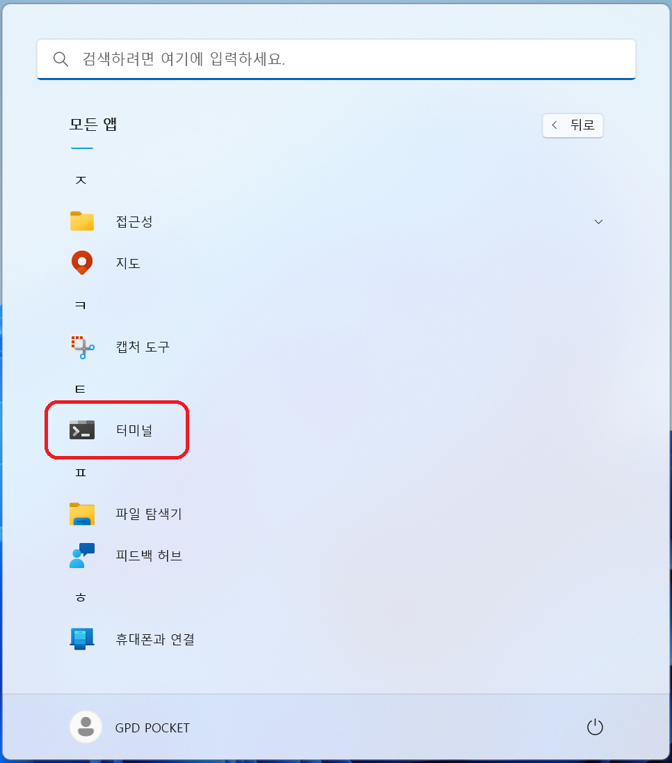 시작 메뉴-"모든 앱"-"터미널"을 클릭하자.