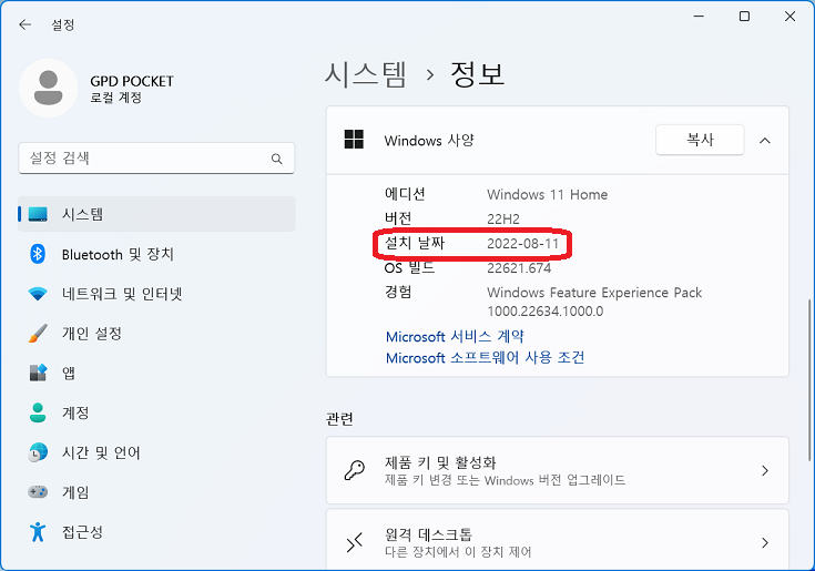 "원래 설치 날짜" 항목에서 확인할 수 있다.
