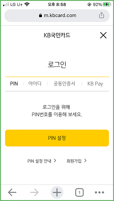 국민카드 회원가입하고 ID와 비밀번호를 입력해도 되고, PIN도 되고, KB Pay 앱으로 로그인해도 된다.