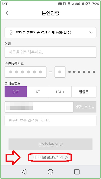 맨 하단에 있는 "아이디로 로그인하기"를 터치하자.