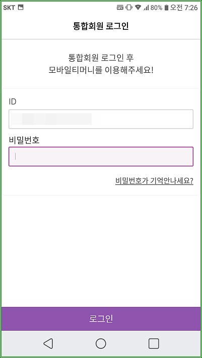 로그인 시 휴대폰 본인인증을 거쳐 로그인했는데, 메인폰의 티머니페이가 로그아웃되고 본인인증을 요구했다.