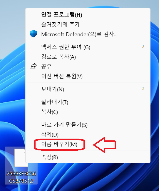 다운받은 파일을 마우스 우클릭하고, "이름 바꾸기"를 클릭하자.