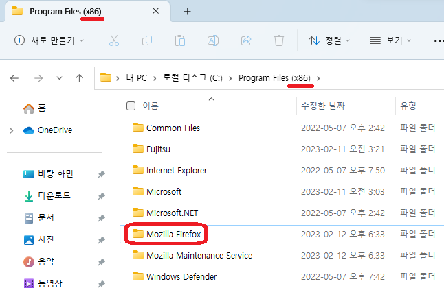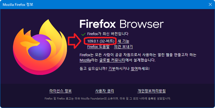 64비트 컴퓨터에 64비트 윈도우11 환경인데도 보시다시피 32비트 파이어폭스로 설치되었다.