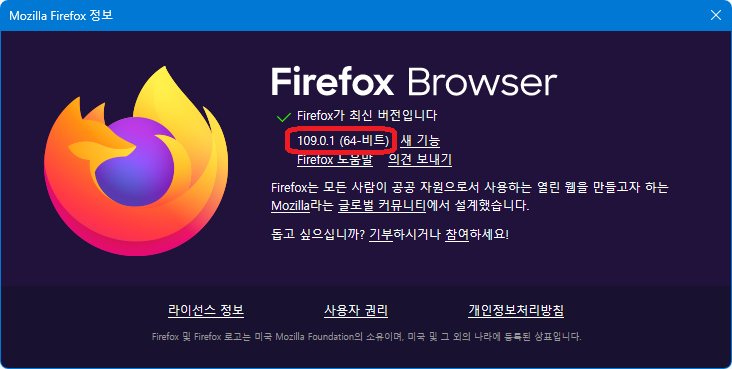*. 컴퓨터에 설치되어 있는 파이어폭스의 32비트/64비트 여부는 파이어폭스 창 우측 작대기 세개 버튼-"도움말"-"Firefox 정보"를 클릭해서 확인할 수 있다.