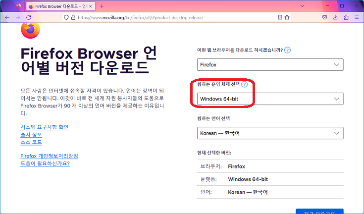 파이어폭스 "모든 버전" 페이지에서 64비트 설치파일을 직접 다운받자[바로가기].