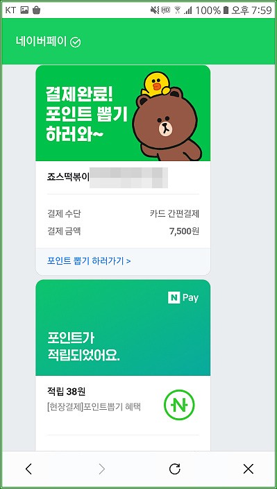 일단 네이버페이에는 결제된 것으로 뜨고, 현장결제 포인트 뽑기도 된다.