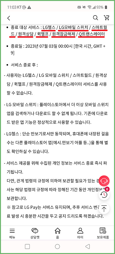 LG 헬스, LG 모바일 스위치, 스마트월드, 원격상담, 퀵헬프, 원격잠금해제, Q트랜스레이터 서비스가 종료된다.