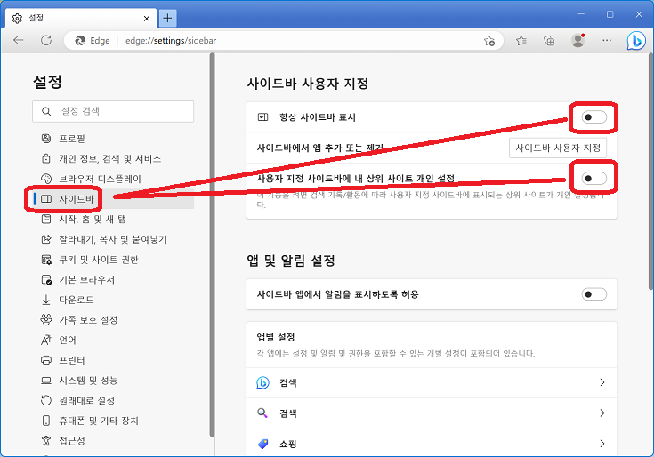 2. "사이드바"를 클릭하고 "항상 사이드바 표시"를 끄고, "사용자 지정 사이드바에 내 상위 사이트 개인 설정"을 끄자.