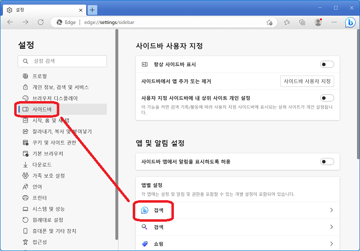 3. 이어서 b 아이콘을 지우려면 "사이드바"의 "앱 및 알림 설정" 항목의 "검색"을 클릭하자.
